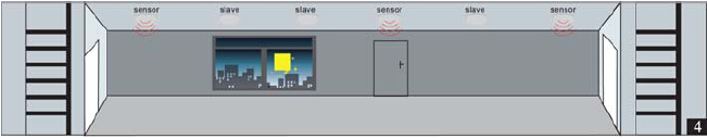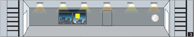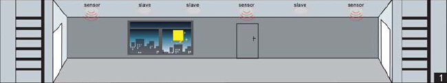 走廊的燈是由幾個(gè)感應(yīng)器控制的。只要有一個(gè)感應(yīng)器感應(yīng)到運(yùn)動(dòng)信號(hào),就會(huì)把信號(hào)傳輸給連接在一起的其他感應(yīng)器,然后所有燈同時(shí)亮。