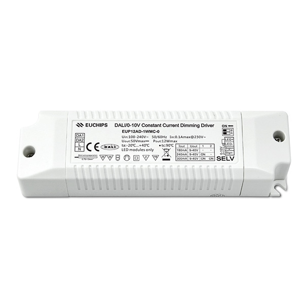 EUP12AD-1WMC-0是一款寬電壓輸入,可以提供180/240/300mA三檔電流的LED驅(qū)動器。輸出電流可以通過DIP撥碼開關(guān)簡易設(shè)置,符合DALI標(biāo)準(zhǔn)協(xié)議IEC62386。支持DALI,0-10V有源信號,可調(diào)電阻,PWM, Touch DIM 多種調(diào)光方式。