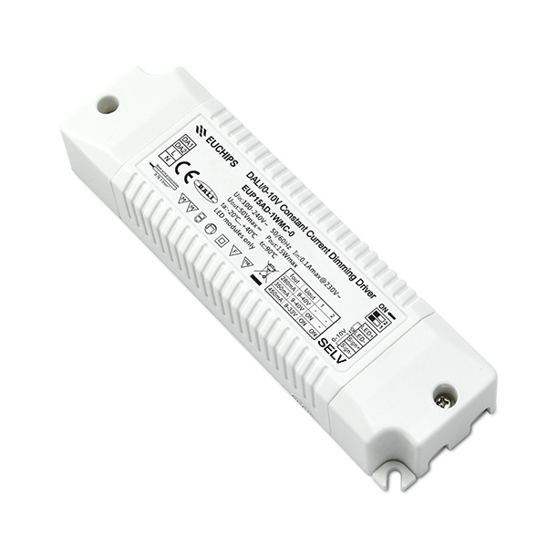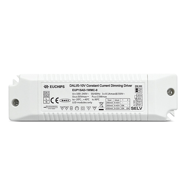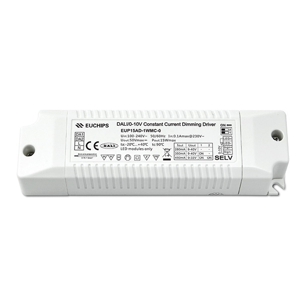 EUP15AD-1WMC-0是一款寬電壓輸入,可以提供280/350/450mA三檔電流的LED驅(qū)動器。輸出電流可以通過DIP撥碼開關(guān)簡易設(shè)置,符合DALI標(biāo)準(zhǔn)協(xié)議IEC62386。支持DALI,0-10V有源信號,可調(diào)電阻,PWM, Touch DIM 多種調(diào)光方式。