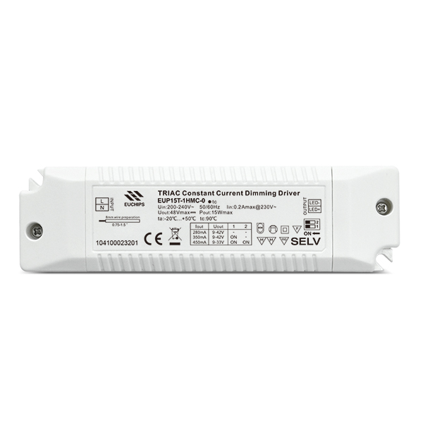 EUP15T-1HMC-0是一款可以提供280/350/380/450mA四檔電流的LED驅動器。這款驅動器支持前沿切相和后沿切相調光器,可以與兼容多品牌系統(飛利浦,ABB,路創(chuàng),西門子,西蒙,松下,邦奇等)配合使用,調光曲線平滑。