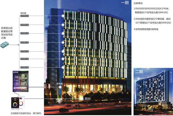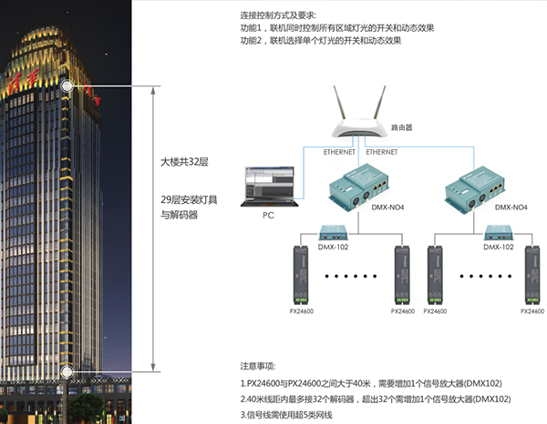 應(yīng)用分析:案例采用歐切斯主控DMX-N04 配合解碼器PX24600以及信號(hào)放大器DMX-102。