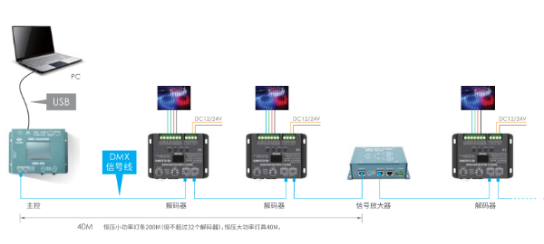 DMX信號(hào)的理想傳輸距離是200m,實(shí)際使用時(shí)由于信號(hào)受外界干擾很大,為保證信號(hào)穩(wěn)定傳輸,一般建議四五十米左右增加一個(gè)信號(hào)放大器。