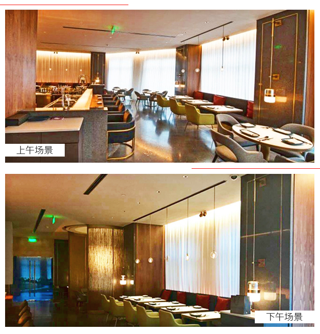 窗簾區(qū)燈光和餐桌吊燈燈光采用歐切斯DMX512和0-10V調(diào)光方式,暖色燈帶與RGB燈帶相結(jié)合,全天遮光簾遮擋強(qiáng)烈的光線,運(yùn)用燈光模擬出白天、下午、傍晚的光線效果。給人營造出一種舒適而又隱私的就餐環(huán)境。