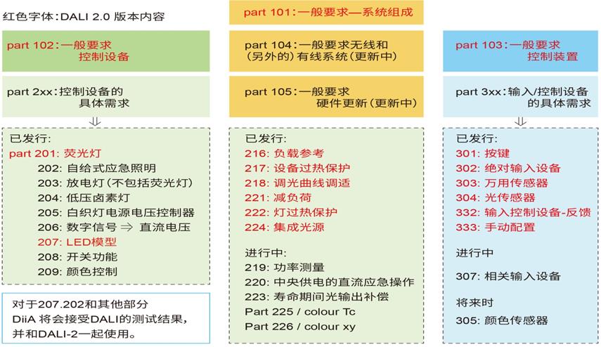 隨著 DALI 標準和照明產(chǎn)品的發(fā)展,獨立的標準 IEC 62386 協(xié)議又可以區(qū)分為 DALI version-1 和 DALI-2 兩個大的版本。
