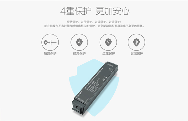 調光電源采取短路,過流,過壓,過溫4重保護,在操作不當和意外情況下,能夠切斷電源,避免驅動器和燈具受到損害,有效的延長燈具和調光設備的使用壽命。
