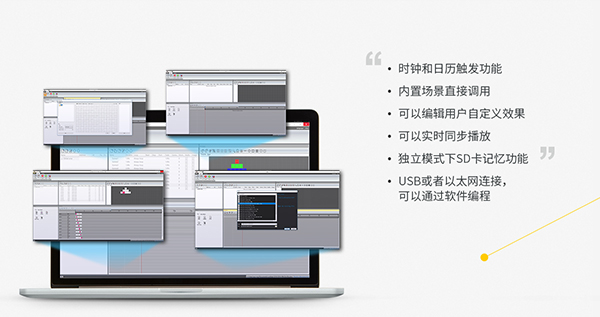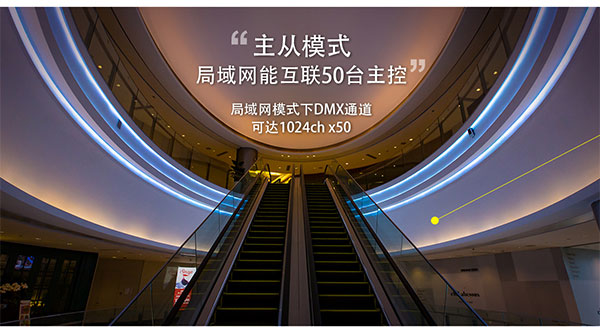 3. 主從模式,更多DMX通道,采用主從模式,通過(guò)局域網(wǎng)能夠互聯(lián)50臺(tái)主控,最多可達(dá)1024CH*50通道。