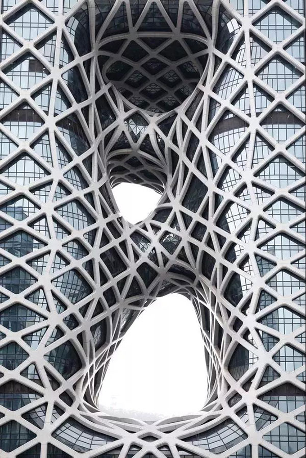 白色骨骼結(jié)構(gòu)的鋼筋包裹著大樓滿滿的“未來感”,讓它在千篇一律的玻璃外墻大樓中一下子跳脫出來,極強(qiáng)的視覺沖擊力,突破傳統(tǒng)的夸張?jiān)煨?,也為城市建筑形象進(jìn)行了顛覆性的升級(jí)。