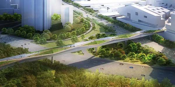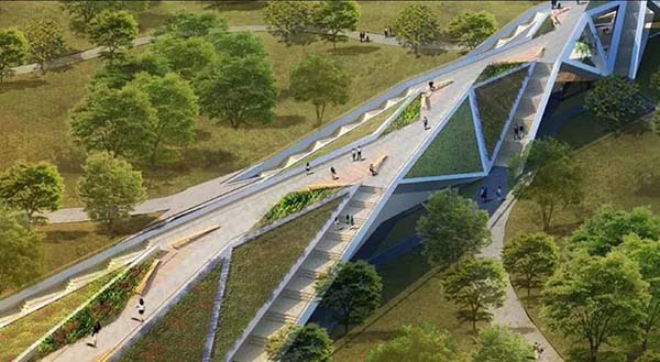 深業(yè)上城基地處于兩大自然公園中間,規(guī)劃布局以“縫合原本割裂的城市自然界面”為策略,分別設(shè)置兩座“生態(tài)綠廊”,將蓮花山、筆架山兩大山體公園聯(lián)系在一起。將自然、城市景觀引入建筑群的同時(shí),公園和綜合體的行為也將相互滲透,使人們得以在“山谷漫游”、“多元商業(yè)體驗(yàn)”和“有序辦公”中找到平衡。