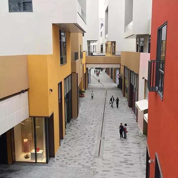 LOFT小鎮(zhèn)位于整個(gè)項(xiàng)目的3-4F,小鎮(zhèn)擁有十?dāng)?shù)棟Loft獨(dú)棟建筑,店鋪外立面采用紅、橙、黃色等暖色調(diào),與藍(lán)天白云相得益彰,并與整個(gè)Loft灰白建筑形成強(qiáng)烈的對比,提升空間視覺感,鮮明的色彩組合讓人有一種置身于地中海小鎮(zhèn)的感覺。