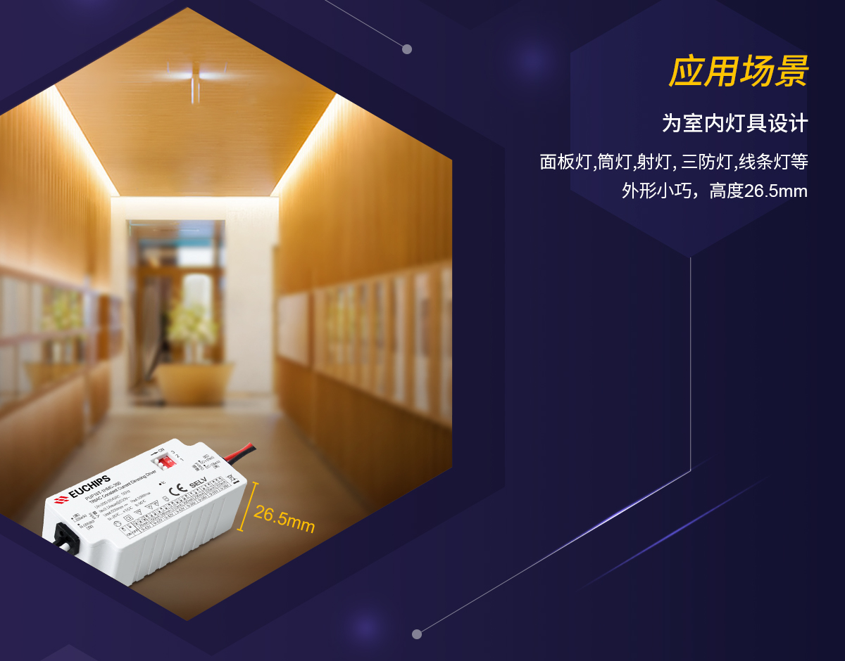 由于電源的尺寸小巧,高度只有26.5mm,因此它的應用場景十分廣闊。室內(nèi)燈具面板燈,筒燈,射燈,三防燈等都可以使用,用戶在燈具設計上擁有更多的選擇。