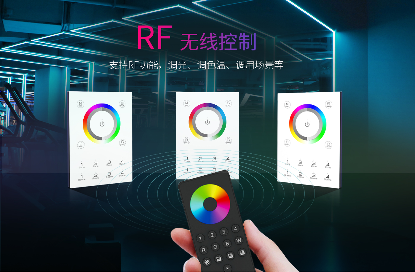 以上幾款面板均支持RF無(wú)線控制功能,通過(guò)匹配遙控器可以對(duì)燈具進(jìn)行調(diào)光,調(diào)色溫,調(diào)用場(chǎng)景等。