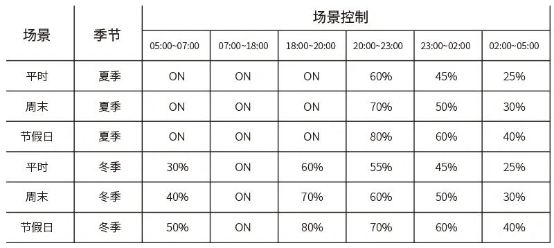 調(diào)試場景設(shè)置參考:冬季(平時、周末、節(jié)假日),夏季(平時、周末、節(jié)假日)。具體照明邏輯參數(shù)根據(jù)現(xiàn)場試燈效果來確定。
