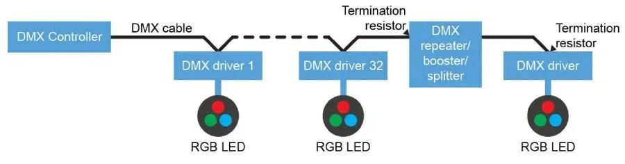DMX是Digital MultipleX的縮寫,意為多路數(shù)字傳輸,光級(jí)別從0到100%分為256級(jí)??刂葡到y(tǒng)能夠?qū)崿F(xiàn)R,G,B,W各256級(jí)灰度,真正實(shí)現(xiàn)全彩色。