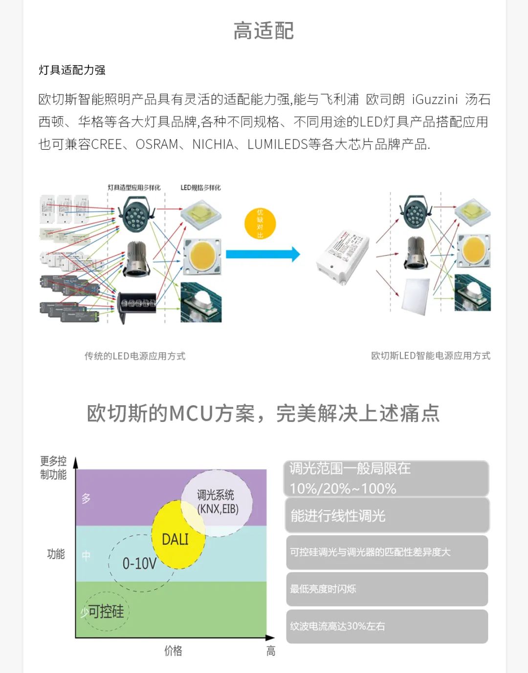 隨后,技術(shù)經(jīng)理分享了各大調(diào)光方式,詳細闡述了模擬調(diào)光和數(shù)字調(diào)光等不同技術(shù)的特點,以及他們在實際應(yīng)用中的優(yōu)勢和局限性。他提到,歐切斯長期深耕于調(diào)光控制技術(shù)的研發(fā)和應(yīng)用,產(chǎn)品具有靈活的適配能力,能與市場上各大燈具品牌,各種不同規(guī)格、不同用途的LED燈具產(chǎn)品搭配使用,更在實際應(yīng)用中完美解決各種技術(shù)上的痛點。
