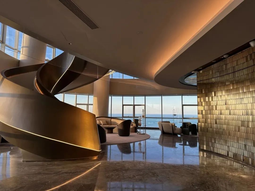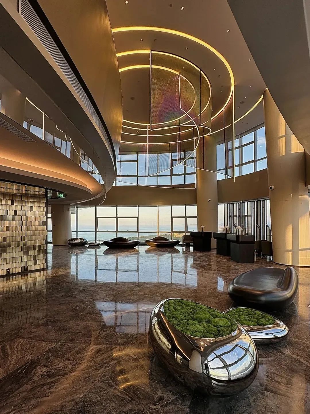 步入位于42層的酒店空中大堂,賓客們仿佛進(jìn)入了一個(gè)流動(dòng)的海森世界。這里的設(shè)計(jì)充滿(mǎn)了度假氛圍,每一處細(xì)節(jié)都透露著輕松與愉悅。大堂中創(chuàng)意采用的“金屬風(fēng)動(dòng)墻”,在歐切斯可控硅智能調(diào)光系統(tǒng)的映襯下,更是顯得波光粼粼、如夢(mèng)如幻,讓賓客們?cè)谑孢m的光環(huán)境中享受美好的時(shí)光。