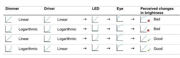 為了實(shí)現(xiàn)可感知的線性調(diào)光,LED的亮度必須與我們眼睛的感知行為相匹配。對于線性調(diào)光器,應(yīng)在驅(qū)動器中使用對數(shù)調(diào)光曲線。對于對數(shù)調(diào)光器,應(yīng)使用具有線性調(diào)光曲線的驅(qū)動器。