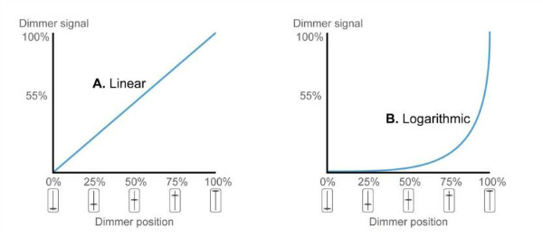 在線性調(diào)光器中,調(diào)光器發(fā)送給驅(qū)動器的信號相對于調(diào)光器滑塊的位置是線性的。例如,如果調(diào)光器的調(diào)到其范圍的25%處,那么發(fā)給驅(qū)動器的信號也將在25%處–見左圖。在對數(shù)調(diào)光器中,發(fā)給驅(qū)動器的信號在較低的調(diào)光級別變化較慢,而在較亮的一端變化更快,見圖右圖。